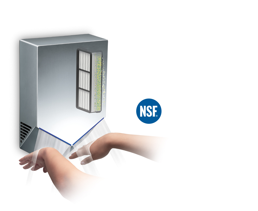 تعمل تكنولوجيا تجفيف ™Airblade بشكل مختلف، حيث يتدفق ما يصل إلى 20 لتراً من الهواء المرشح عبر فلاتر HEPA عبر فتحات بعرض حتى0.55 مم كل ثانية؛ مما يؤدي إلى توليد طبقات هواء بسرعة 690 كم في الساعة والتي تقوم بتجفيف الأيدي بطريقة صحية في غضون 12 ثانية فقط.